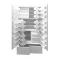 Шкаф включает в себя нишу, находящуюся за двумя дверьми и два выдвижных ящика. Ящики установлены на роликовых направляющих. На дверях и фасадах ящиков закреплена хромированная мебельная ручка. К двери прикреплены три пластиковые полки для хранения фармпрепаратов (с тремя лотками каждая). В шкафу установлено шесть двухсторонних пластиковых поворотных полок (с шестью лотками каждая). За поворотными полками находятся пять съёмных полок и две стационарные полки. Имеется перегородка отделяющая нишу, закрываемую дверьми, от ящиков. Шкаф установлен на четырех регулируемых по высоте хромированных опорах.