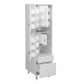 Шкаф имеет две двери и два выдвижных ящика (ящик большой и ящик малый). Ящики установлены на роликовых направляющих. На дверях и фасадах ящиков закреплена хромированная мебельная ручка. К каждой двери прикреплена одна пластиковая полка для хранения фармпрепаратов (с тремя лотками). В верхней части шкафа также имеется двухсторонняя пластиковая поворотная полка (с шестью лотками). За поворотной полкой находятся две съёмные полки. В шкафу имеется встроенный запираемый ящик. Задняя стенка ящика выполнена из ламинированной ДСтП белого цвета. Ниже ящика расположена съёмная полка, а также межьярусная перегородка, отделяющая нишу, закрываемую дверьми, от ящиков. Шкаф установлен на четырех регулируемых по высоте хромированных опорах.