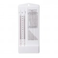 На пластмассовом основании закреплены температурная шкала с двумя капиллярами, один из которых увлажняется фитилем из ткани, опущенным в питатель с водой, рядом прикреплена таблица, по которой определяется относительная влажность воздуха.