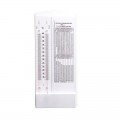 На пластмассовом основании закреплены температурная шкала с двумя капиллярами, один из которых увлажняется фитилем из ткани, опущенным в питатель с водой, рядом прикреплена таблица, по которой определяется относительная влажность воздуха.